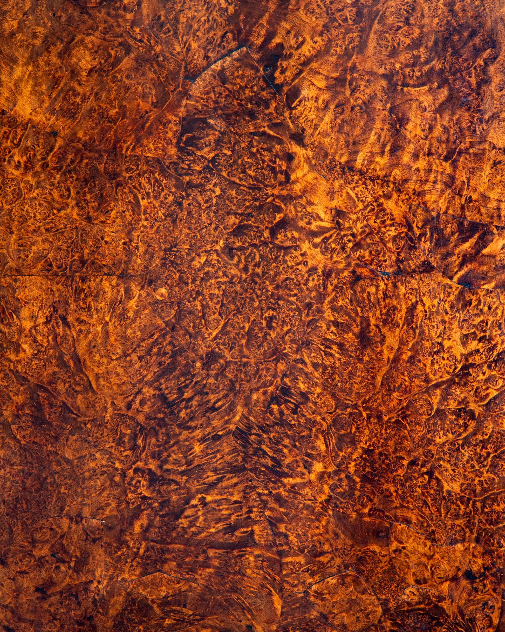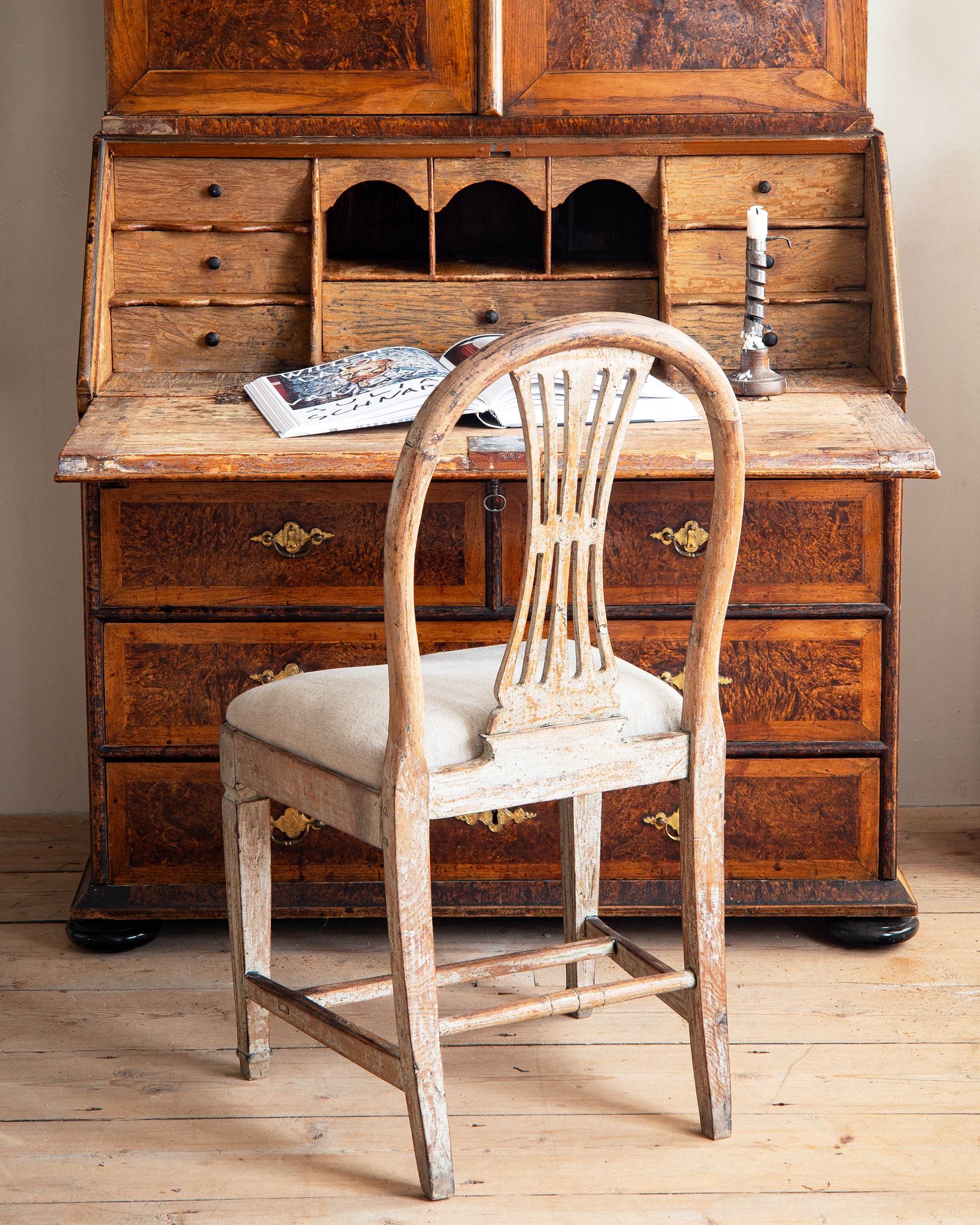 Fine 18th century Swedish Baroque secretary cabinet in burled root grain veneer in an great patinated surface and brass details. There is a hidden compartment and the shelves are removable. Ca 1740 Sweden.
